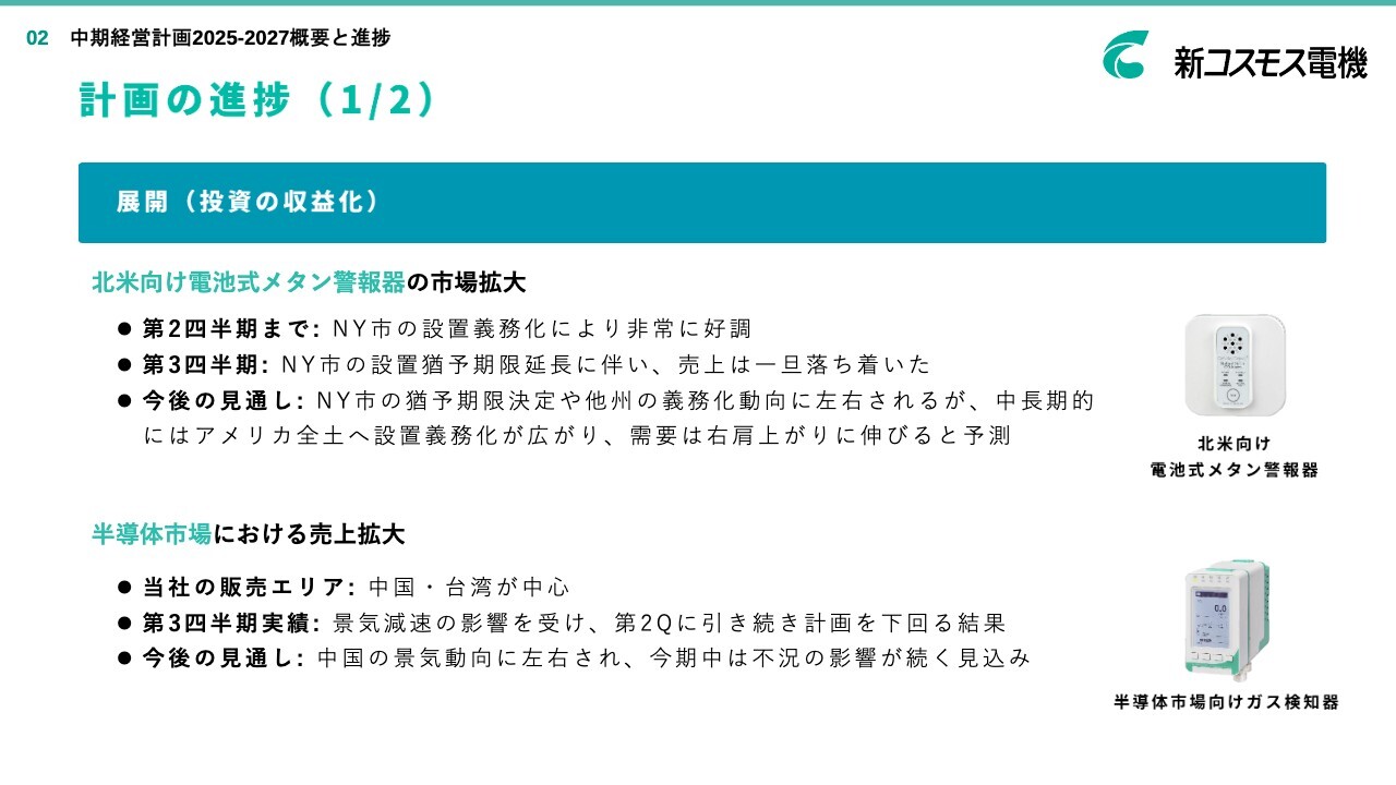 北米は前年同期と比べると、先ほどからお話をしている家庭用電池式メタン警報器が好調で計画を上回る数字となったものの、当第3四半期は落ち着いてきています。