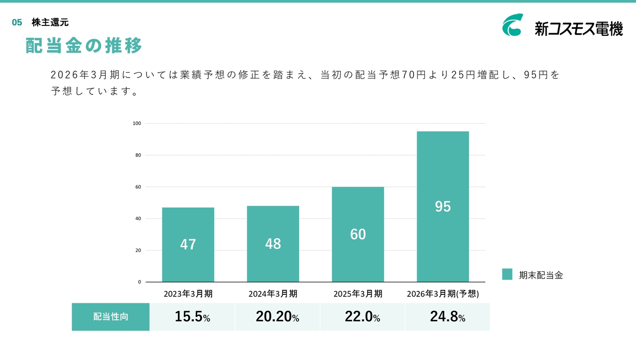 今回の業績予想の修正を踏まえ、株主のみなさまからのご支援にお応えするため、1株当たりの期末配当予想を直近の配当予想より25円増配し95円とします。
