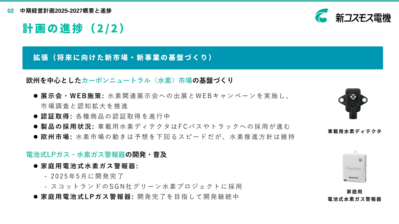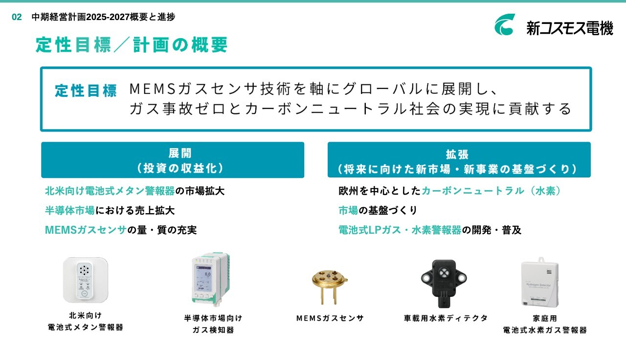 「展開」では主に北米向け電池式メタン警報器の市場拡大や、半導体市場における売上拡大に取り組んでおり、「拡張」としては主に欧州におけるカーボンニュートラル市場の基盤づくり、そして、LPガス・水素ガスといった家庭用電池式警報器のラインナップ拡充に取り組んでいます。