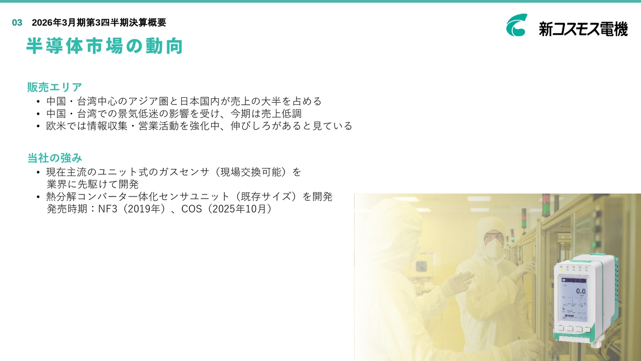 当社の半導体市場向けガス検知器の販売エリアについては、中国・台湾を中心としたアジア圏と日本国内が売上のほとんどを占めています。特に中国・台湾での売上が大きいことから、現在の景気低迷の影響を受け、今期の売上は低調となっています。