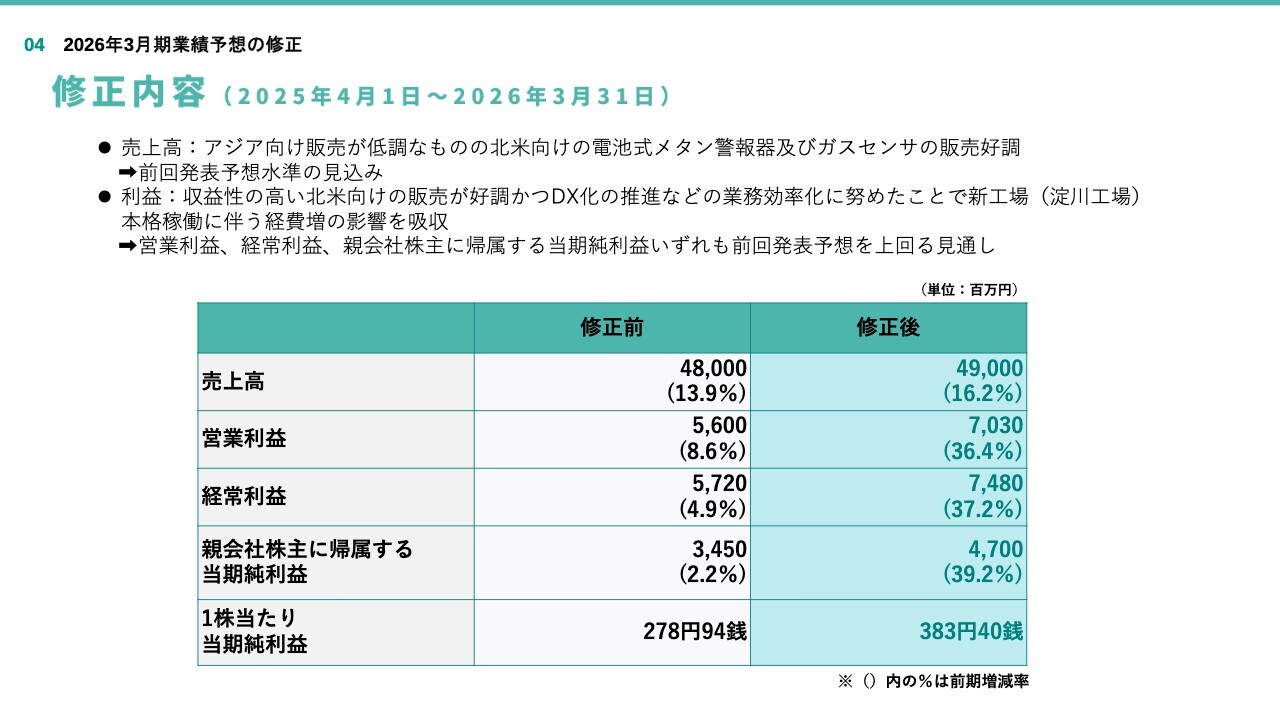 売上高については、アジア向けの販売が低調に推移したものの、北米向けの電池式メタン警報器及びガスセンサの販売が好調であったことから、概ね前回発表予想の水準となる見込みです。