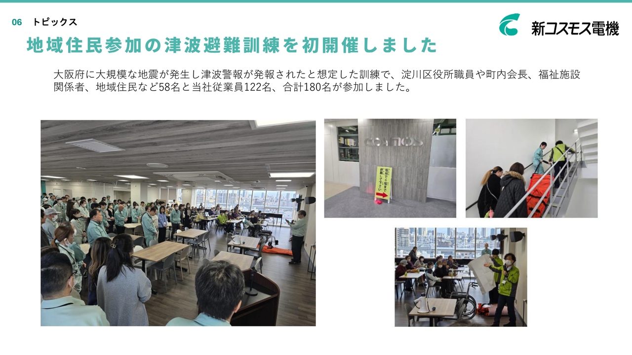 12月3日に、当社淀川工場にて、地域住民参加の津波避難訓練を初めて実施しました。大阪府に大規模な地震が発生し津波警報が発報されたと想定した訓練で、淀川区役所・町内会・福祉施設の関係者、地域住民など58名と当社従業員122名、合計180名が参加しました。