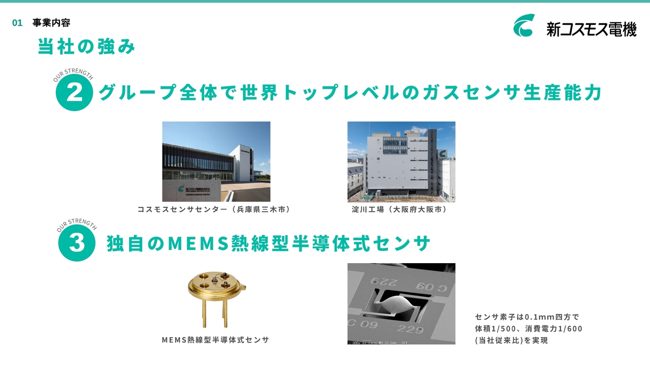2つ目は、ガスセンサ生産能力が世界トップレベルにあることです。兵庫県三木市にあるコスモスセンサセンター、そして2025年に開設した淀川工場、さらにグループ会社であるフィガロ技研の工場で、数多くのガスセンサを生産しています。
