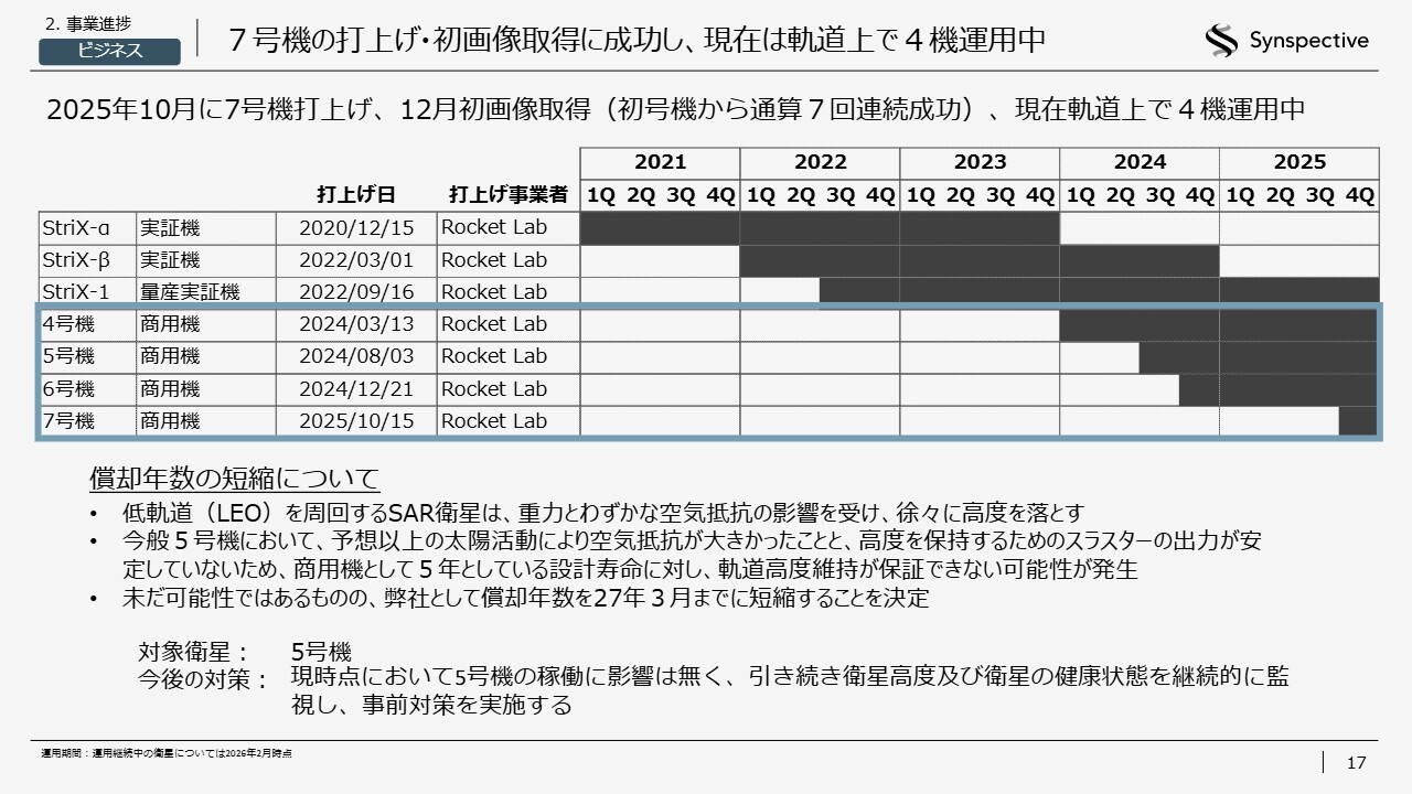 技術面では、衛星の開発・製造・打上げについてお伝えします。昨年10月には7号機の打上げに成功し、12月には初画像取得を公表しました。続く8号機は、打上げ事業者であるRocket Lab社からの通知に基づき、2026年第1四半期に打上げ予定となっています。近日中にこちらも公表できる見込みです。