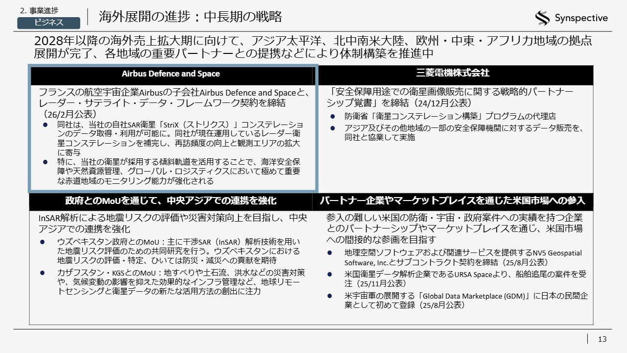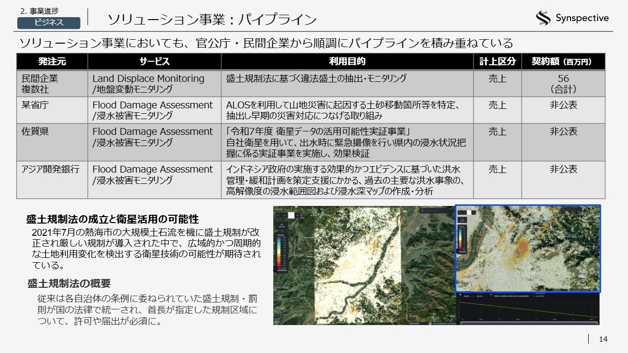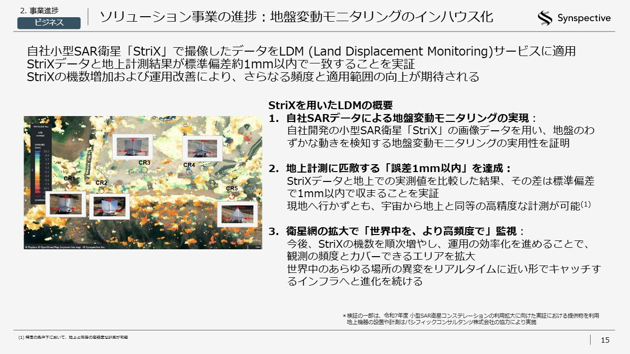ソリューション事業についてです。海外展開については、Synspectiveが想定していたよりも早いタイミングで拡大可能であると判断しており、私たちも自信を深めているところです。また、もう1つ重要なマーケットのドアオープナーとして、ソリューションの開発があります。こちらはコツコツと積み上げてきた取り組みです。