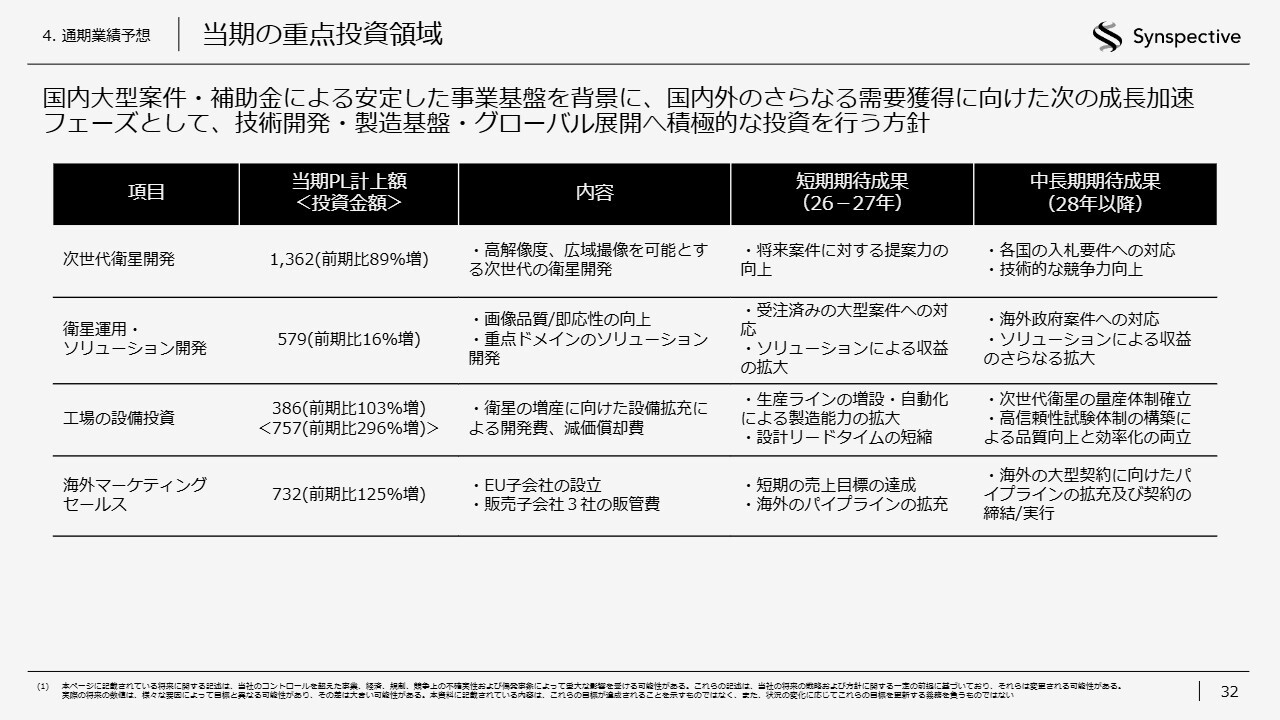 経常利益は、今期からの黒字化を見込んでいます。一方、営業損失は拡大する見込みです。主な要因は、次のスライドで示す投資の拡大や、コンステレーション構築のための体制強化が挙げられます。