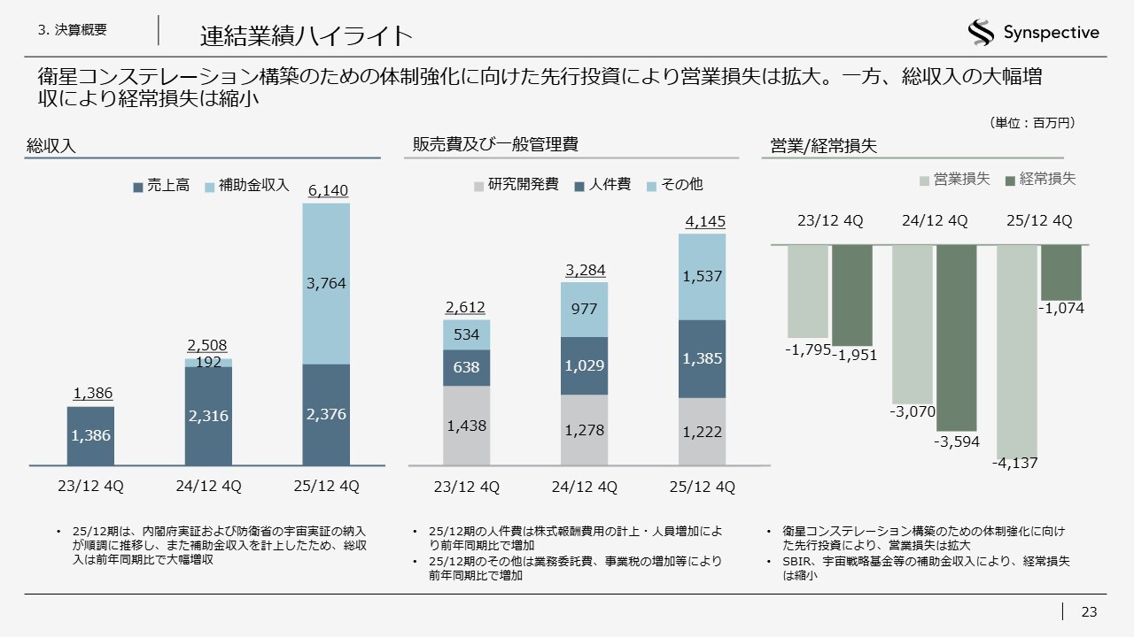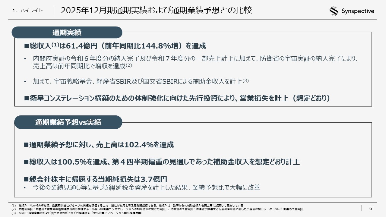 2025年12月期通期の業績ハイライトについてご説明します。総収入は61.4億円で、前期比144.8パーセント増を達成しました。内閣府実証の令和6年度分の納入完了および令和7年度分の一部売上計上に加え、防衛省の別案件の宇宙実証の納入完了により、売上高が前年同期比で増収となりました。また、宇宙戦略基金や、経済産業省および国土交通省のSBIRによる補助金収入も計上しています。