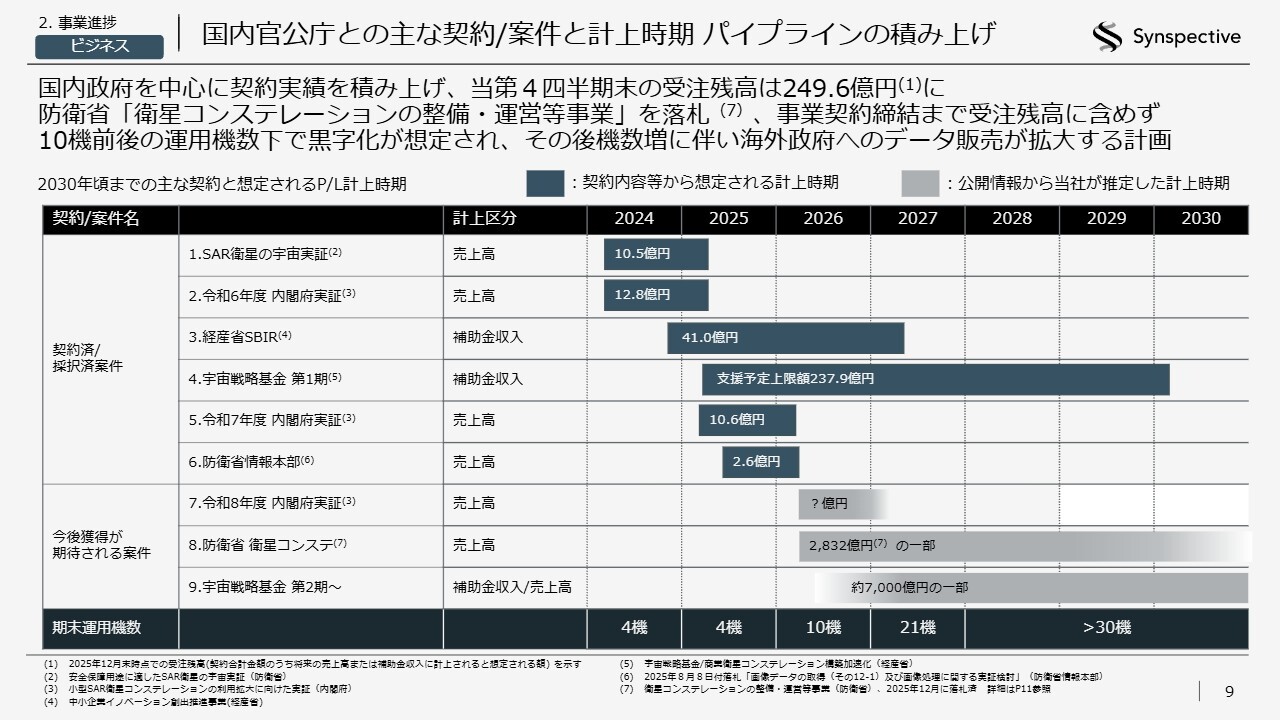 先ほどもお話ししましたが、受注残高は249.6億円に達しています。防衛省の「衛星コンステレーションの整備・運営等事業」を落札していますが、こちらはまだ事業契約締結前のため受注残高には含めていません。10機前後の運用機数の範囲で黒字化が想定されており、現在、それを基に海外政府へのデータ販売を加速しています。