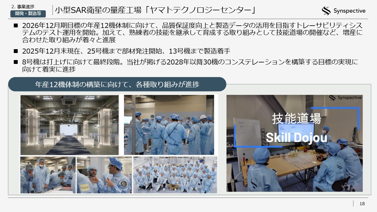 また、量産工場であるヤマトテクノロジーセンターは順調に稼働しており、防衛省の「衛星コンステレーションの整備・運営等事業」案件に向けて、準備が順調に進められています。