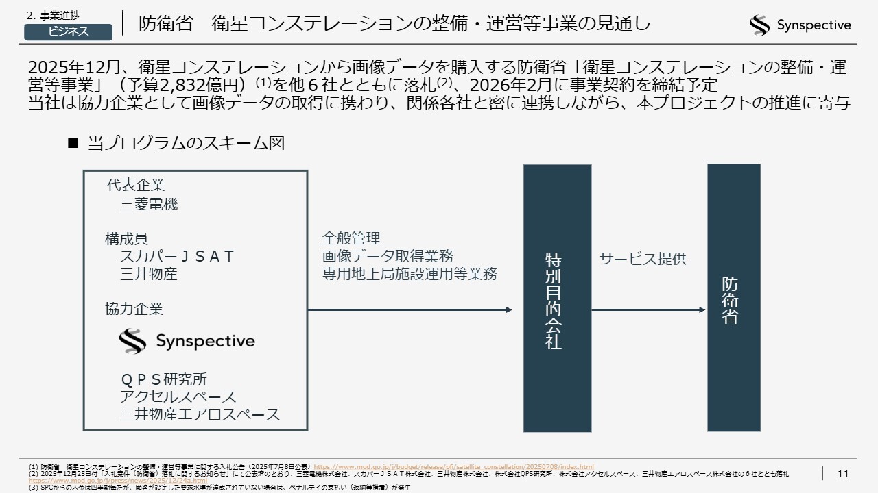 防衛省の「衛星コンステレーションの整備・運営等事業」についてです。今回は当事業のスキームを提示するにとどめています。先ほど、他6社と構成するコンソーシアムで落札したとご説明しましたが、三菱電機社を代表企業としてSPC(特別目的会社)を設立しました。構成員は、スカパーJSAT社と三井物産社です。
