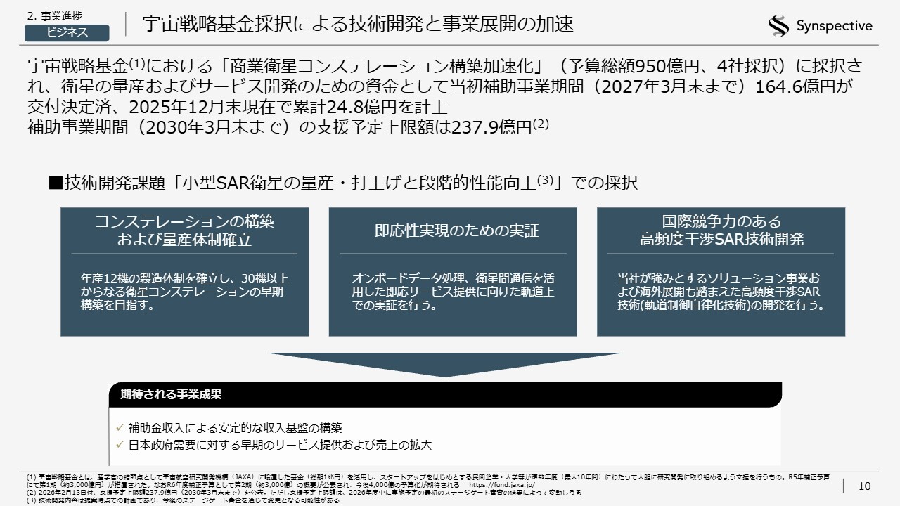 また、昨年のクリスマスに発表しましたが、防衛省の総額2,832億円の予算がつく「衛星コンステレーションの整備・運営等事業」をコンソーシアムとして落札しました。