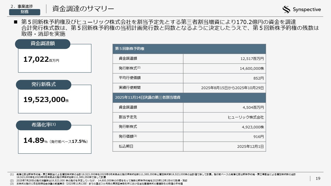 第5回新株予約権およびヒューリック株式会社を割当予定先とする第三者割当増資により、170.2億円の資金を調達しました。この件については昨年何度かご説明してきたとおりです。当初の予定では約1,950万株の発行を計画していましたが、1,450万株程度の行使時点でいったん停止し、未行使分の約500万株をヒューリック株式会社に割り当てることとしました。
