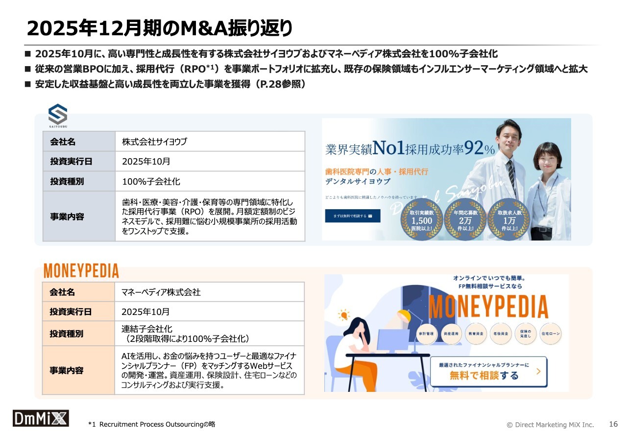 2025年12月期に実施した2件のM&Aを振り返ります。まず、昨年10月に株式会社サイヨウブおよびマネーペディア株式会社を完全子会社化しました。