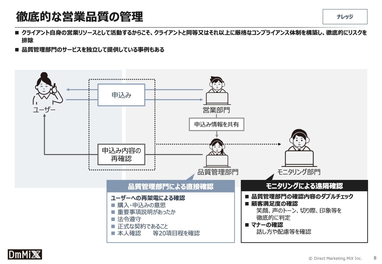 祖業であるアウトバウンド領域では、属人性の高い営業プロセスを標準化することで、ダイレクトマーケティングミックスグループとして独自の「売れる仕組み」を確立してきました。