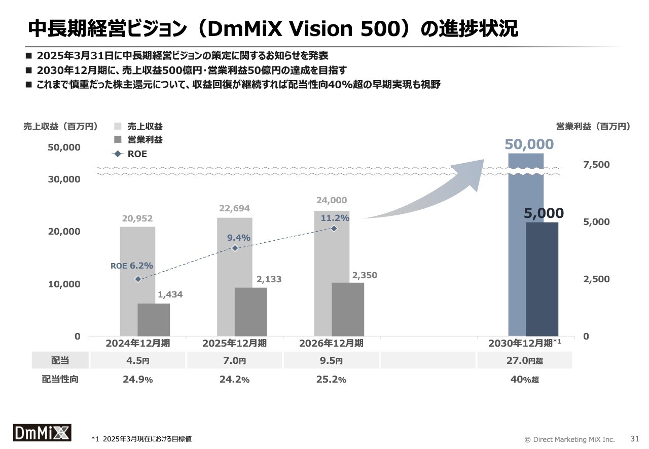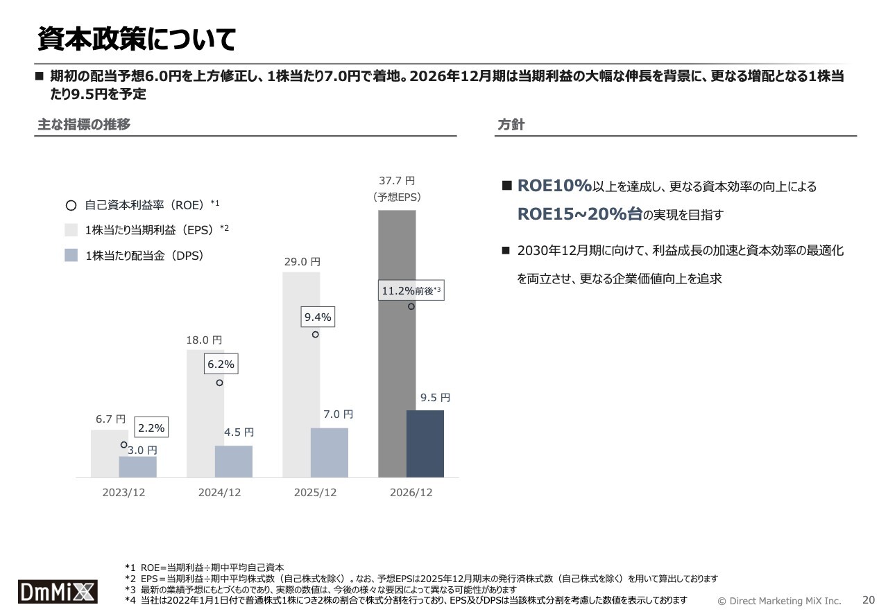 今後の資本政策の方針としては、短中期的にはROE10パーセント以上の維持とさらなるアップサイドの追求、中長期的な投資回収フェーズでは20パーセント台の実現を目指します。中長期経営ビジョン「DmMiX Vision 500」の最終年度である2030年12月期に向け、利益成長の加速と資本効率の最適化を両立させ、さらなる企業価値の向上を追求していきます。