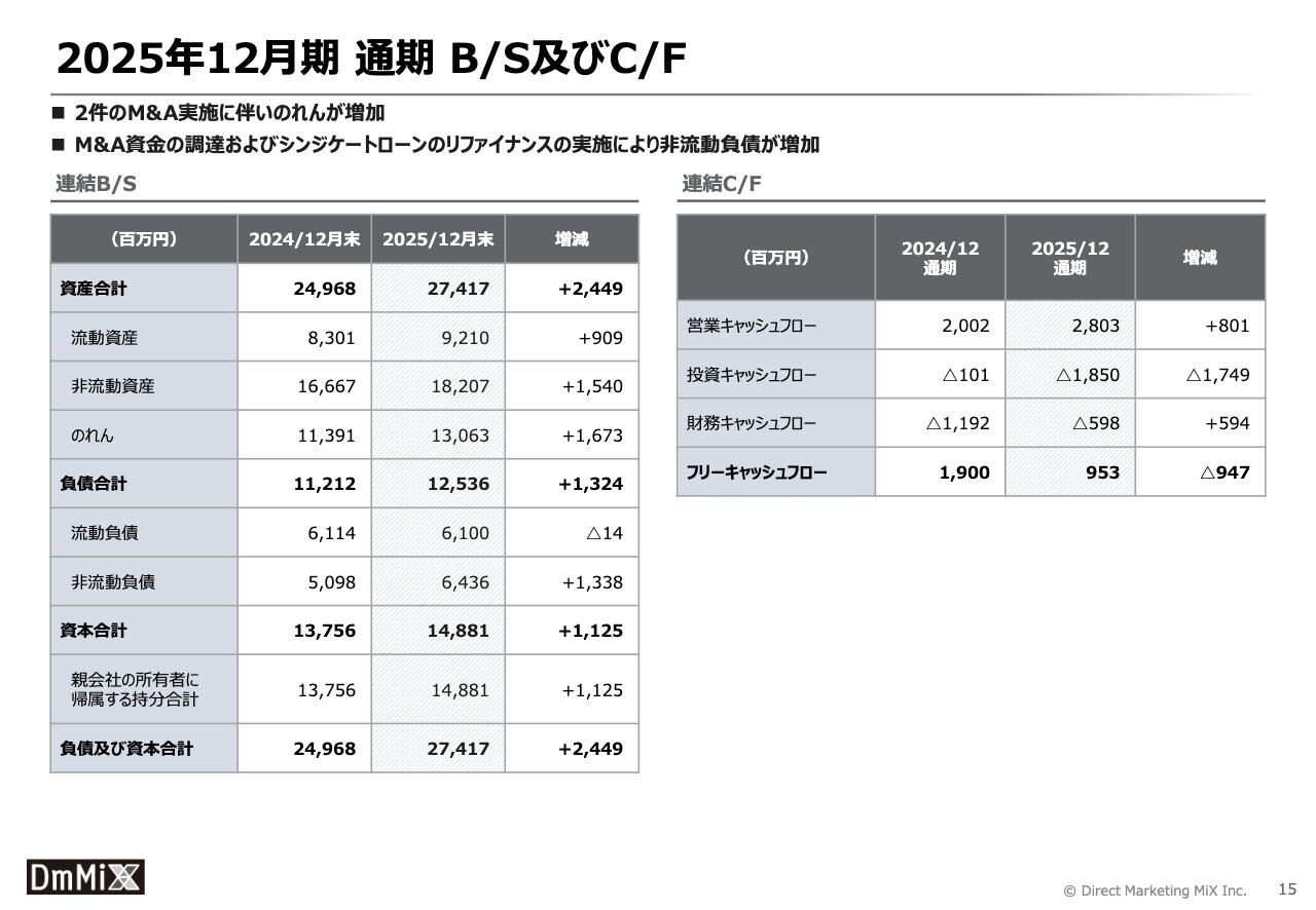 連結ベースでのバランスシートとキャッシュフローです。2025年12月期は、2件のM&Aを実施したことによりのれんが増加しています。負債の部では、M&Aに伴う資金調達に加え、シンジケートローンのリファイナンスを実施したため、非流動負債が増加しています。