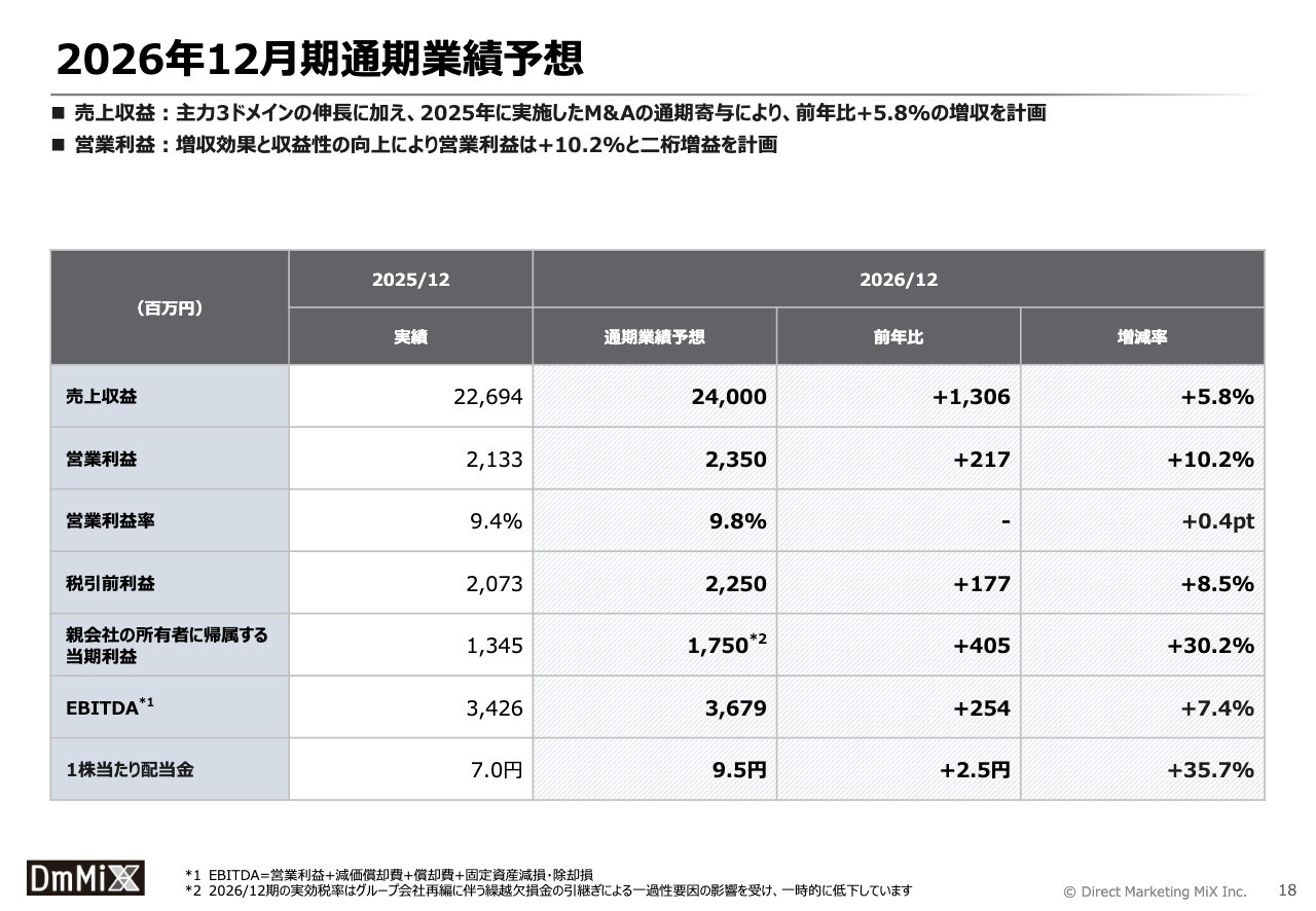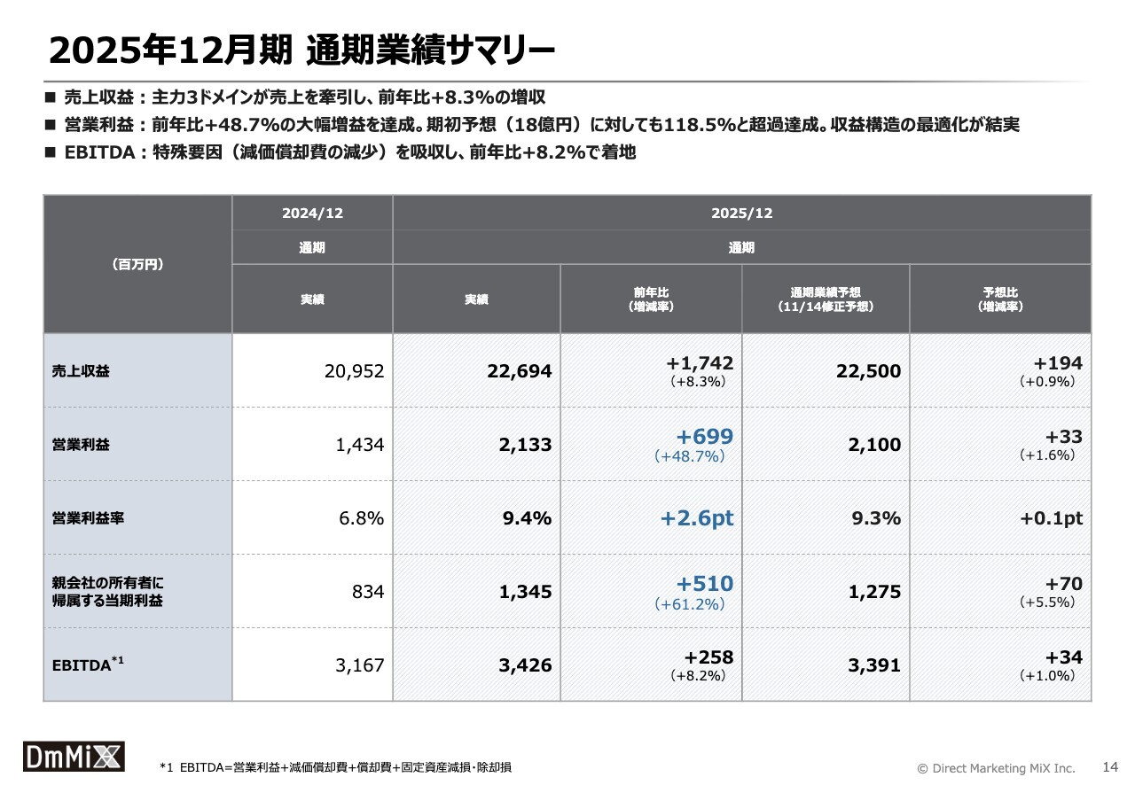 植原大祐氏(以下、植原):株式会社ダイレクトマーケティングミックス代表執行役社長CEOの植原です。本日はお忙しい中ご参加いただき、誠にありがとうございます。2月13日に発表した2025年12月期通期決算についてご説明します。