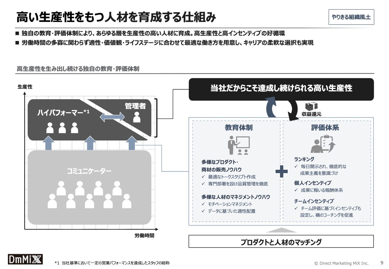 3つ目は「やりきる組織風土」です。当社は、独自の教育評価体制を導入し、あらゆる層を生産性の高い人材に育成します。