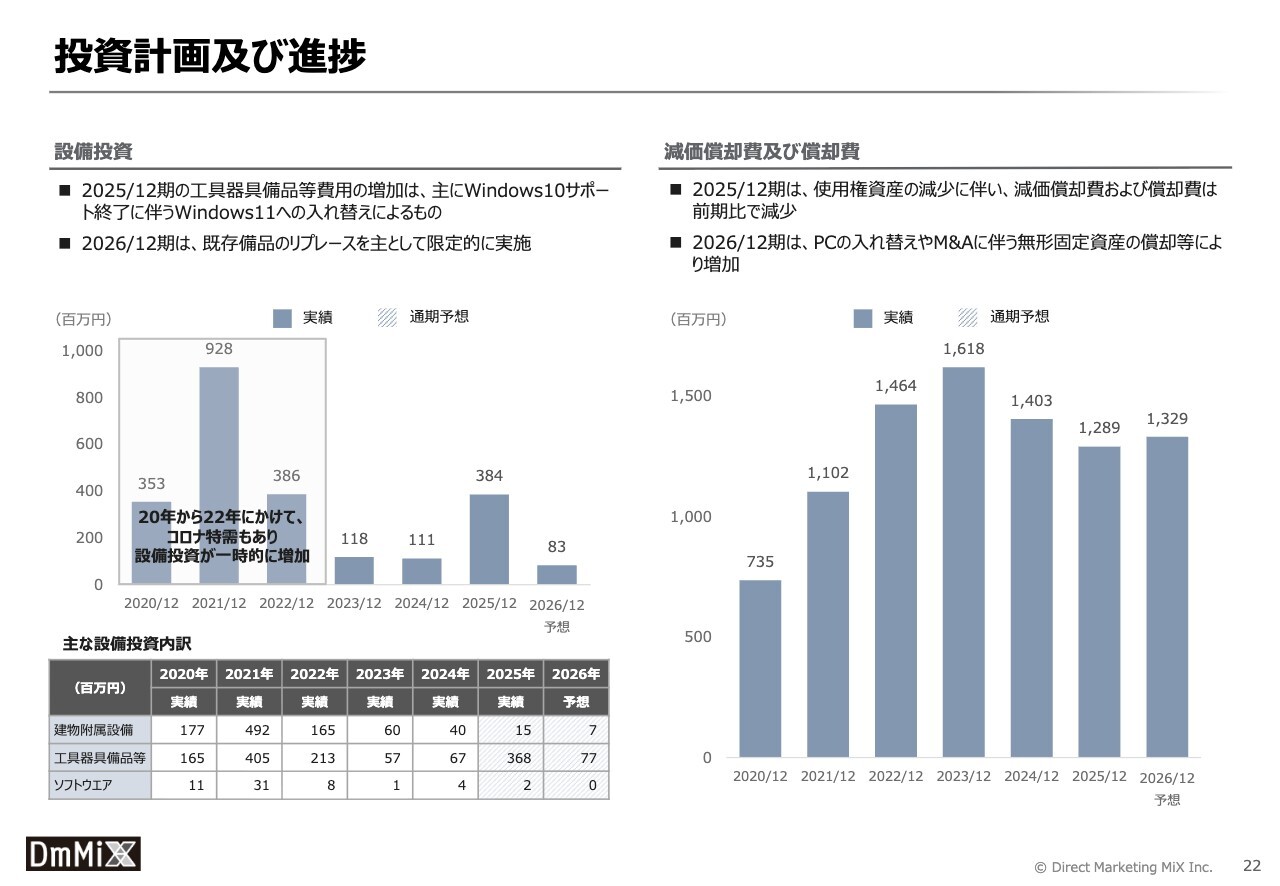 また、2025年12月期は、前年に一部の採算性の低い拠点を撤退したことに伴い使用権資産が減少した結果、減価償却費および償却費は前年比で減少しました。2026年12月期は、パソコンの入れ替えによる有形固定資産の増加に加え、M&Aで取得した無形固定資産の償却が本格化することから、減価償却費および償却費が増加する見込みです。