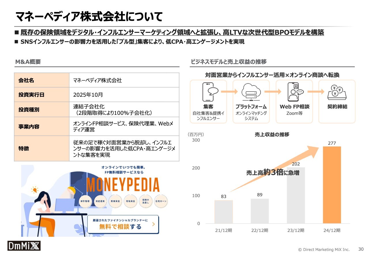 マネーペディアについてです。このM&Aは、当社がこれまで強みとしてきた保険領域のBPOを、デジタル・インフルエンサーマーケティング領域へ拡張することを目的としています。