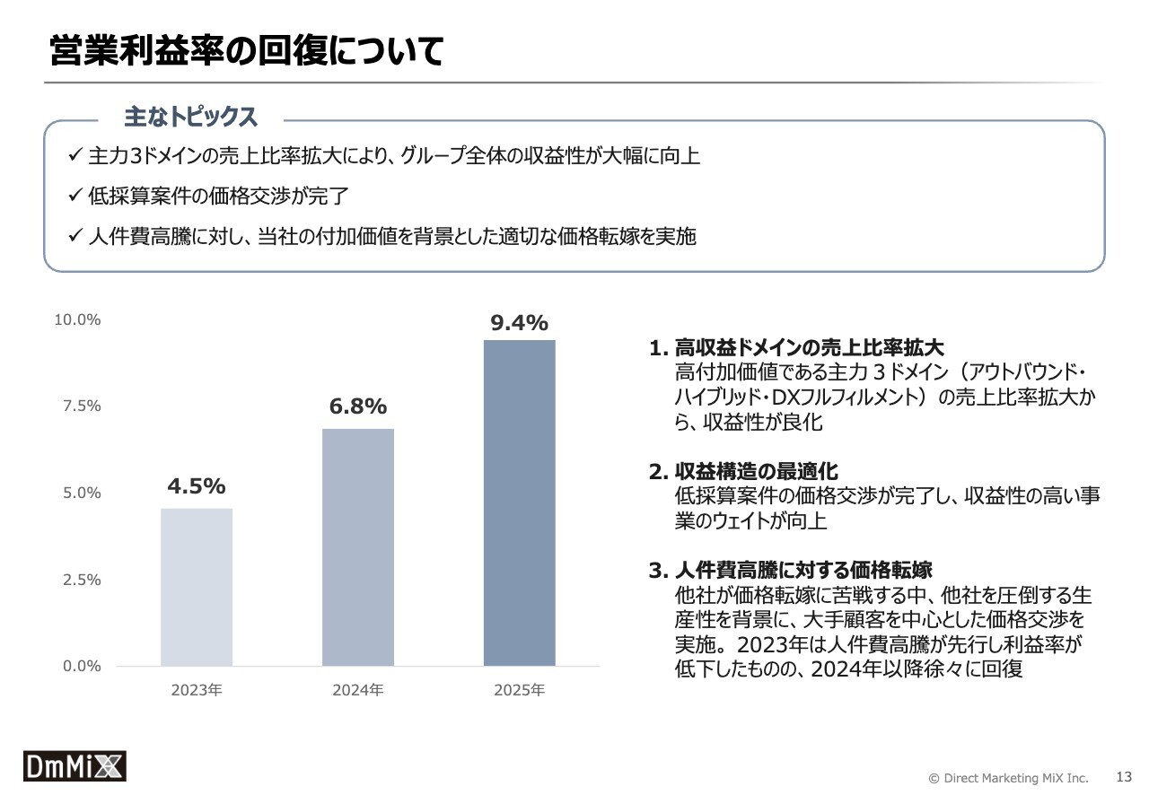 1つ目は、高収益ドメインの売上比率の拡大です。高付加価値なアウトバウンド、ハイブリッド、DXフルフィルメントの主力3ドメインに注力し、これらの領域の売上比率が高まったことで、グループ全体の収益性が大幅に向上しています。