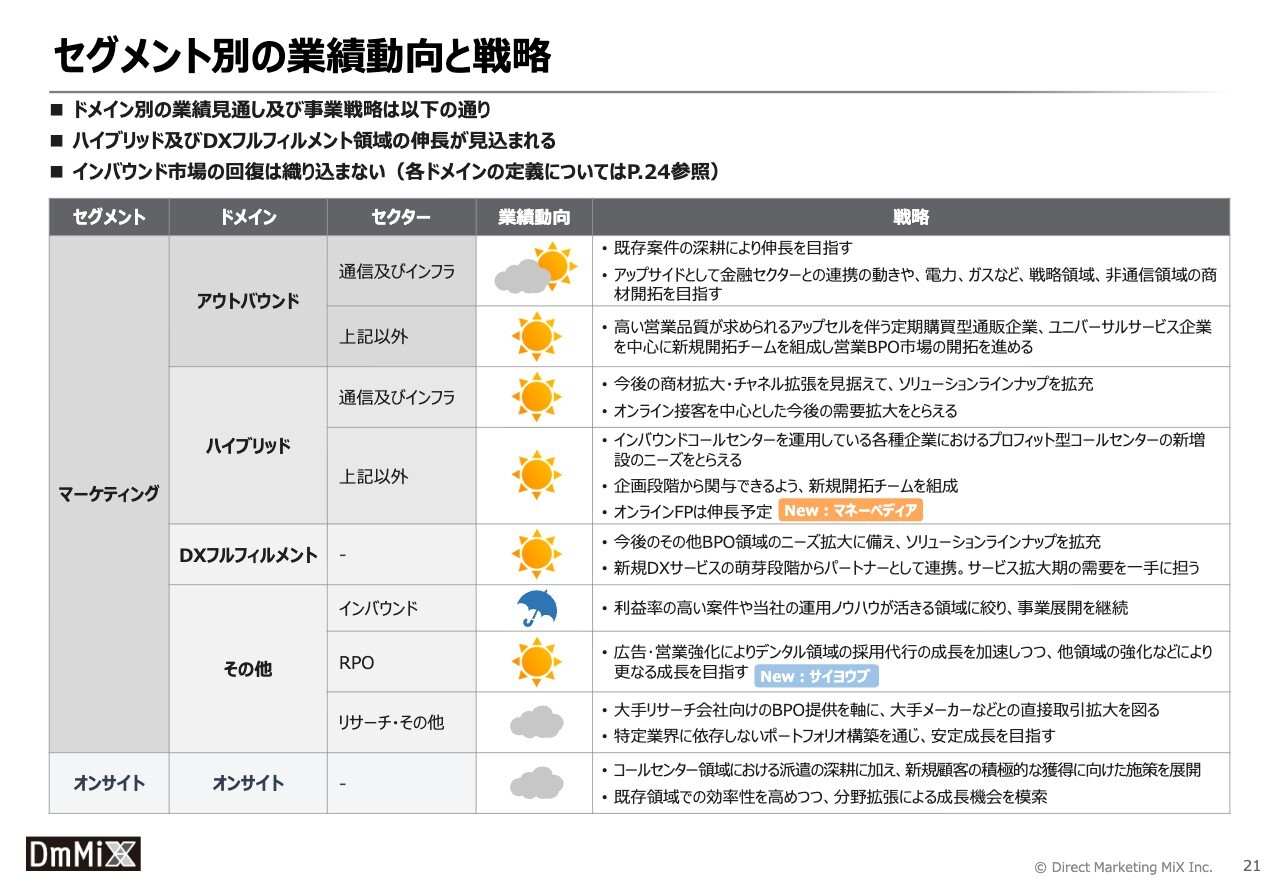 スライドはドメイン別の業績見通しおよび事業戦略です。マーケティング事業は、祖業であるアウトバウンドに加え、クライアントニーズの多様化を背景に、2020年以降、ハイブリッドおよびDXフルフィルメントといった新たなドメインで急速に業容を拡大してきました。