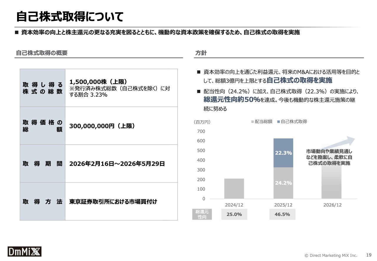 ダイレクトマーケティングミックス、営業利益は前年比+48.7%の大幅増益 自己株式取得の実施を発表