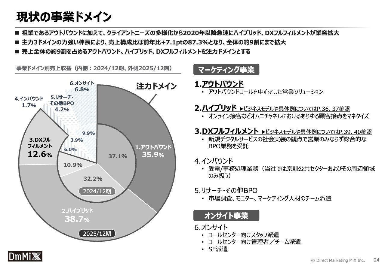 中長期成長戦略についてお話しします。スライドは現状の事業ドメインを示しています。祖業であるアウトバウンドに比べ、クライアントニーズの多様化によりハイブリッドおよびDXフルフィルメントのドメインが2020年以降に拡大してきました。