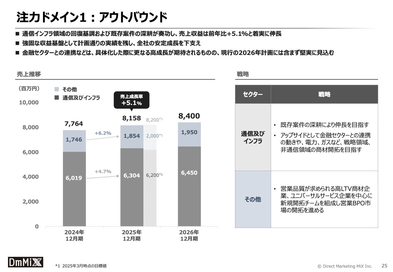 各ドメインおよび注力ドメインについて簡単にご説明します。1つ目はアウトバウンドです。スライド左側に売上推移、右側に戦略を記載しています。