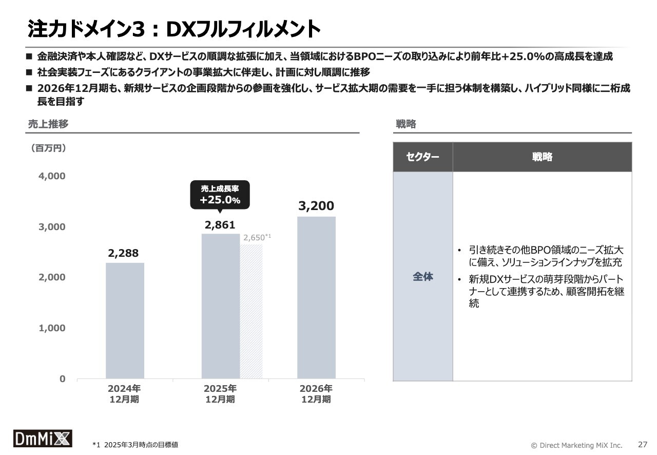 3つ目は、DXフルフィルメントです。金融決済や本人確認といったDXサービスが順調に拡張していることに加え、これらの領域におけるBPOニーズを着実に取り込んだ結果、売上収益は前年比25パーセント増と高い成長を達成しました。また、「DmMiX Vision 500」発表時に掲げた目標に対しては107.9パーセントの進捗で、超過達成しています。