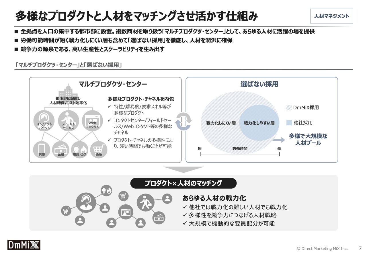 また、全拠点が複数商材を扱う「マルチプロダクツ・センター」で、1つの拠点で多様なプロジェクトを取り扱い、多様なチャネルで展開していることで、さまざまな人材に対応する仕組みとなっています。