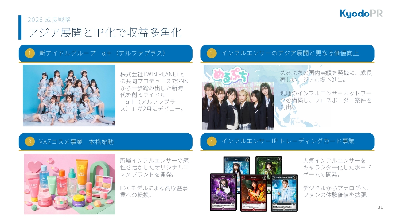 インフルエンサーマーケティング事業では、従来のタイアップ収益やメディア収益に加え、アジア展開とIP化による収益の多角化に挑戦していこうと考えています。