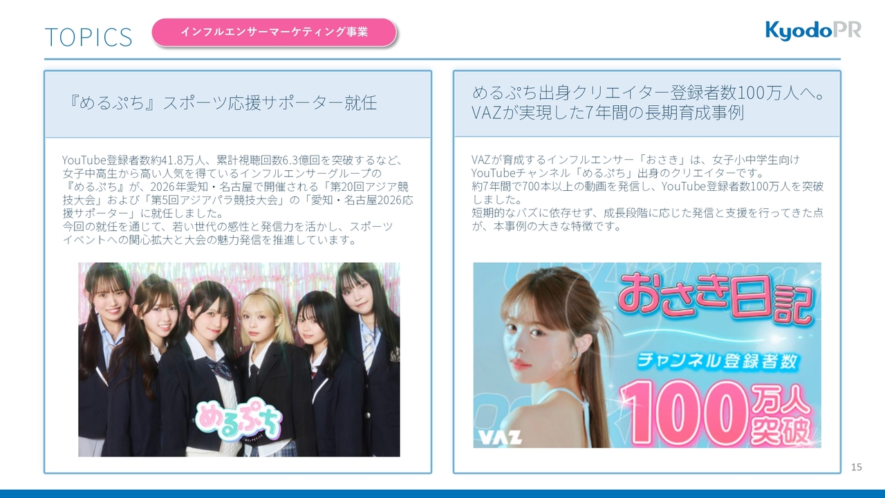 2つ目として、グループ会社のVAZに所属するインフルエンサーのおさきが、「Youtube」登録者100万人を突破しました。おさきは、女子小中高生から非常に人気が高いインフルエンサーグループ「めるぷち」出身のクリエイターですが、VAZがインフルエンサーを長期育成してきた実績の1つです。