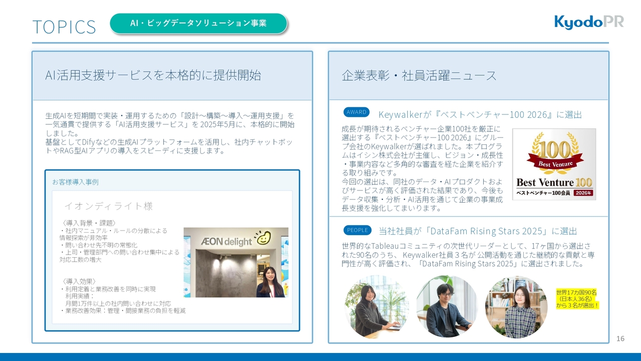 最後に、AI・ビッグデータソリューション事業のトピックスを3つご紹介します。
