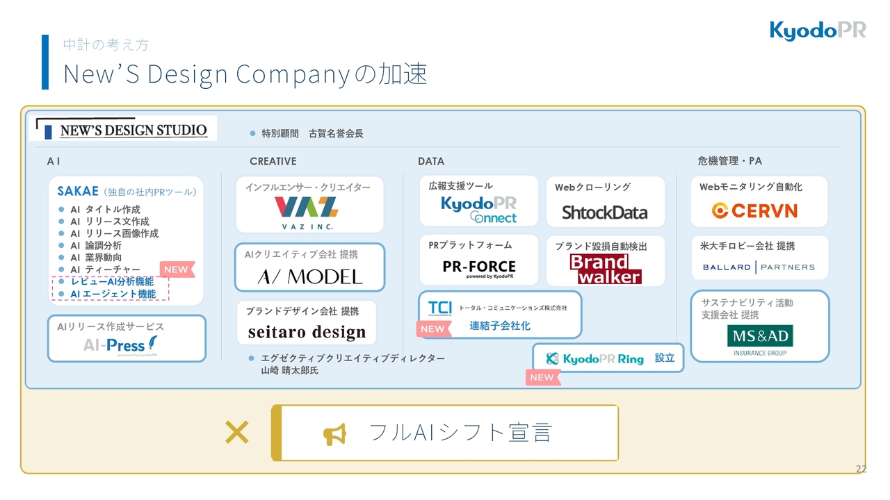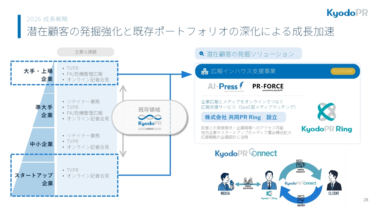 その中で当社は、新たに共同ピーアールRing社を設立しました。同社は、リリースをAIで自動作成する「AI-Press」や、豊富なメディアリストを活用して配信できる「PR-FORCE」、さらに、企業とメディアをオンラインでつなぐSaaS型のメディアマッチングサービスを提供する会社です。