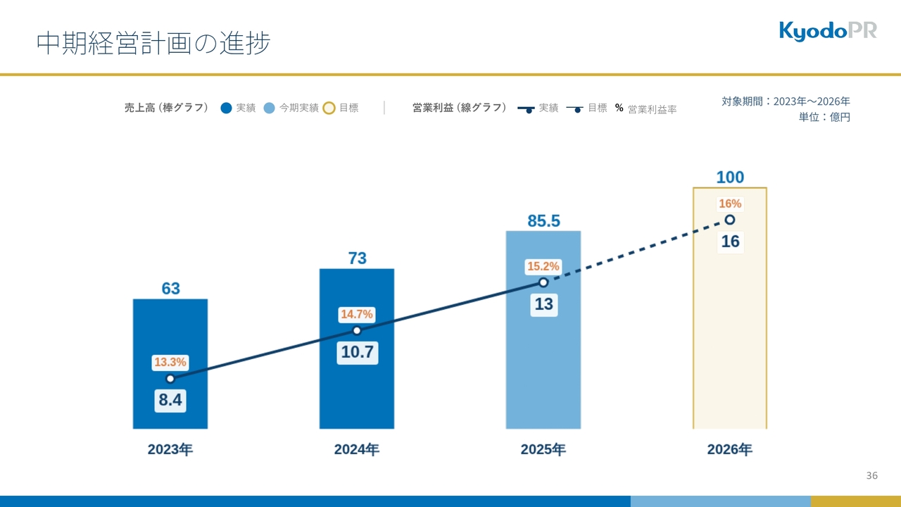 中期経営計画の進捗状況はスライドに記載のとおり、1年目の2024年、2年目の2025年と、おおむね中期経営計画どおりに最終的な実績が出ています。
