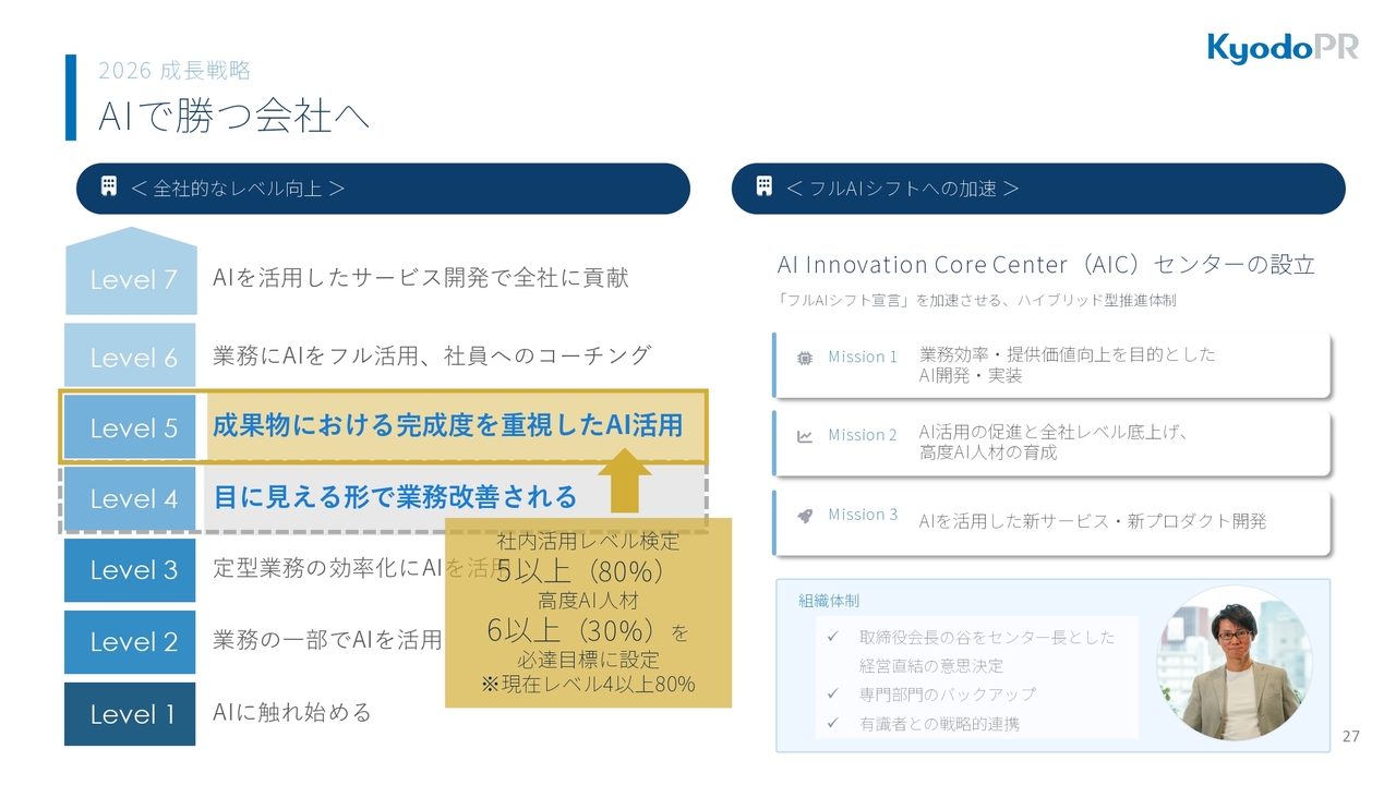 当社は、AIで勝つ会社を目指しています。全社的なAIレベルの向上として、まずは、社内AI活用レベル検定において、2026年度末までに全社員の80パーセントが7段階中、レベル5以上に達することを目指します。
