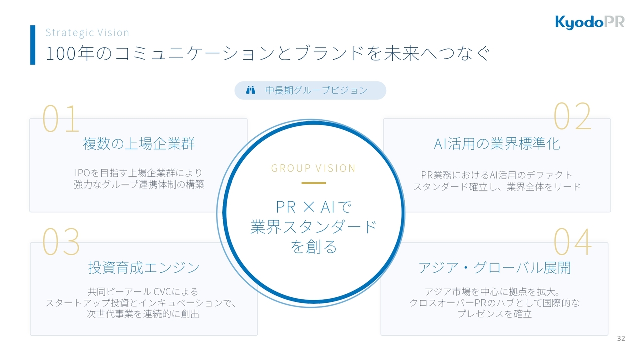 最後に、中長期のグループビジョンをご説明します。「PR×AIで業界スタンダードを創る」を中心に据え、1つ目に、将来的には複数の上場企業群、IPOを目指す上場企業群でグループの連携体制を構築していきます。