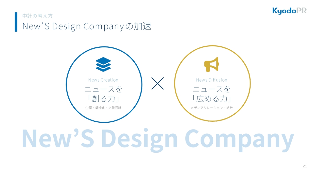 中期経営計画では、当初の「New ‘S Design Companyになる」というミッションのもと、ニュースを「創る力」と「広める力」の共同化を目指しています。