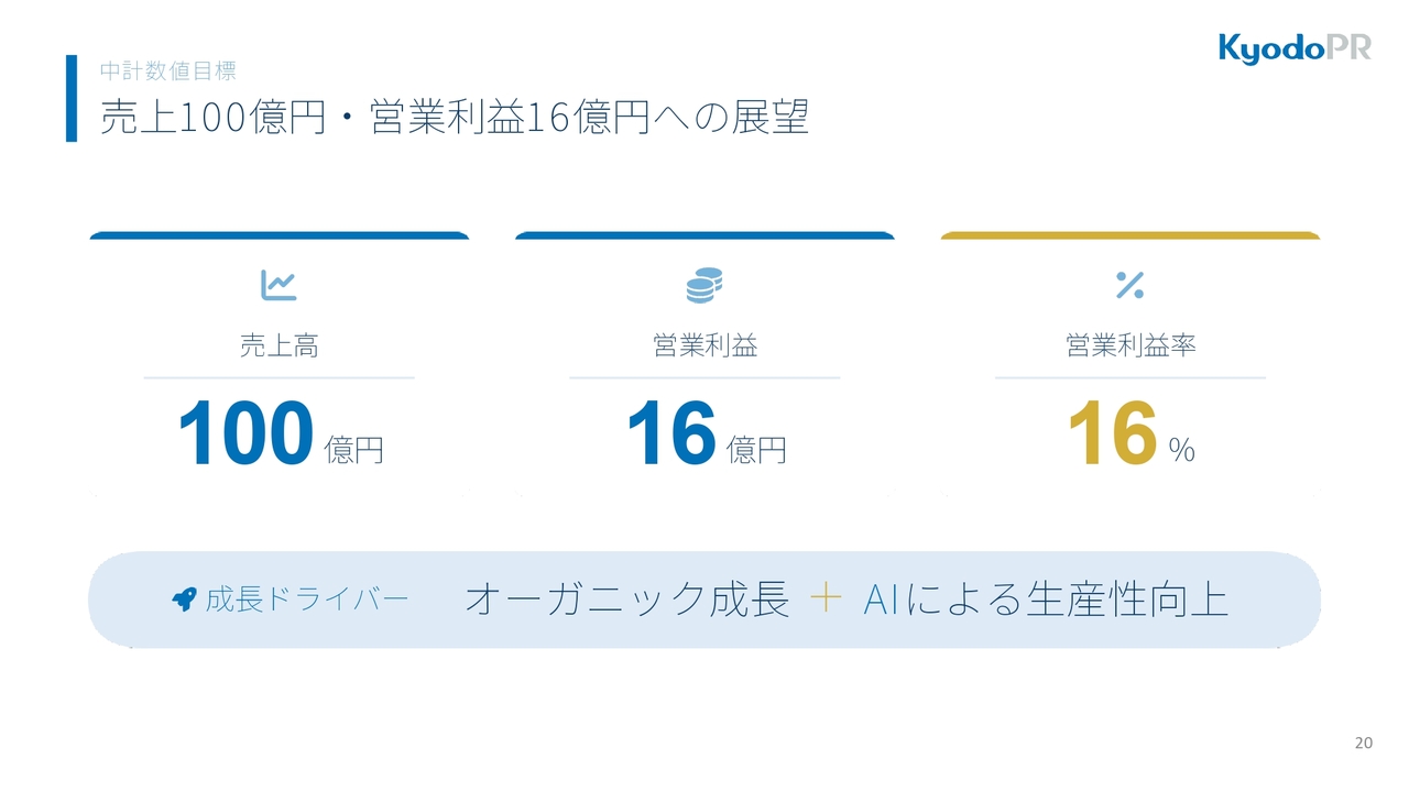 事業目標は、売上高100億円、営業利益16億円とし、従来のオーガニック成長にAIを掛け合わせて成長させていく考えです。