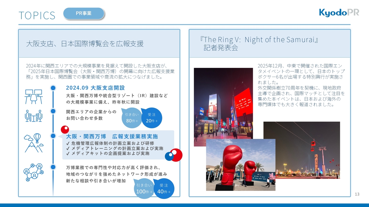 2つ目に、2025年12月に中東地域で開催された国際エンターテインメントイベントの一環として、日本のトッププロボクサー6名が出場する特別興行についてご紹介します。このイベントは外交関係樹立70周年を機に、現地政府と仕事をしたものです。おかげさまで、日本および海外の専門媒体に大きく報道されました。また、11月には国内で大規模な記者発表を実施しましたが、そちらも当社が担当しました。