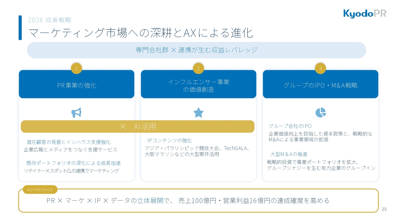 2026年度は、マーケティング市場への深掘りとAXによる進化を進めます。PR事業の強化やインフルエンサー事業での価値創造、さらにグループ会社のIPOやM&A戦略において、AIを活用します。