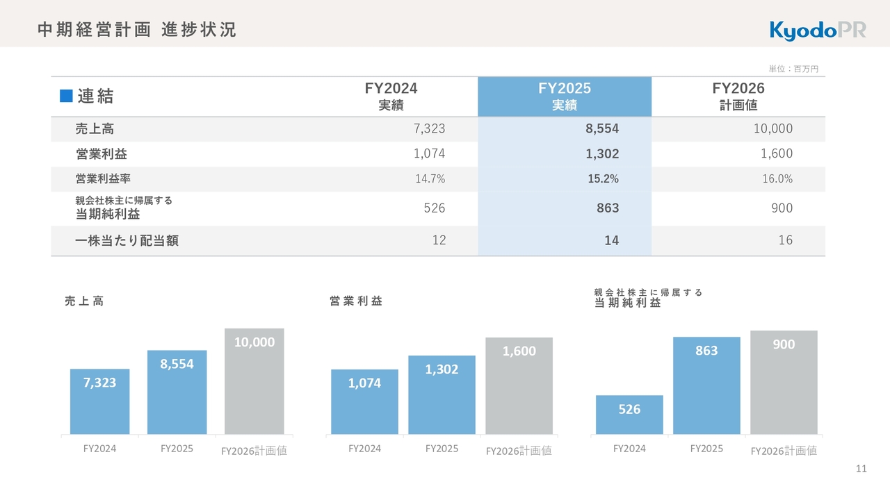 2025年度の配当は、すでに開示したとおり、2024年度よりも2円増配し、14円となります。2026年度はさらに2円増配し、16円を計画しています。