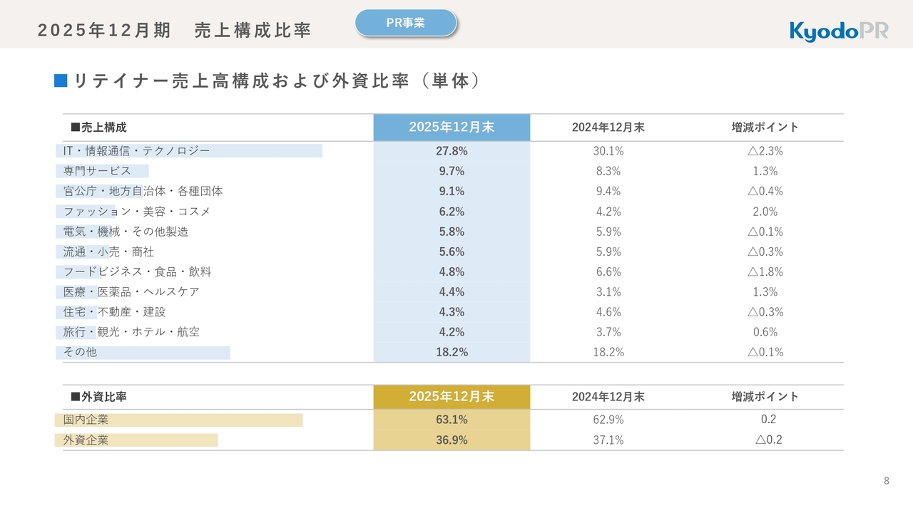 毎回ご報告しているPR事業のリテイナー売上高構成については、IT・情報通信・テクノロジーの構成比は、以前と変わらず3割弱となっています。