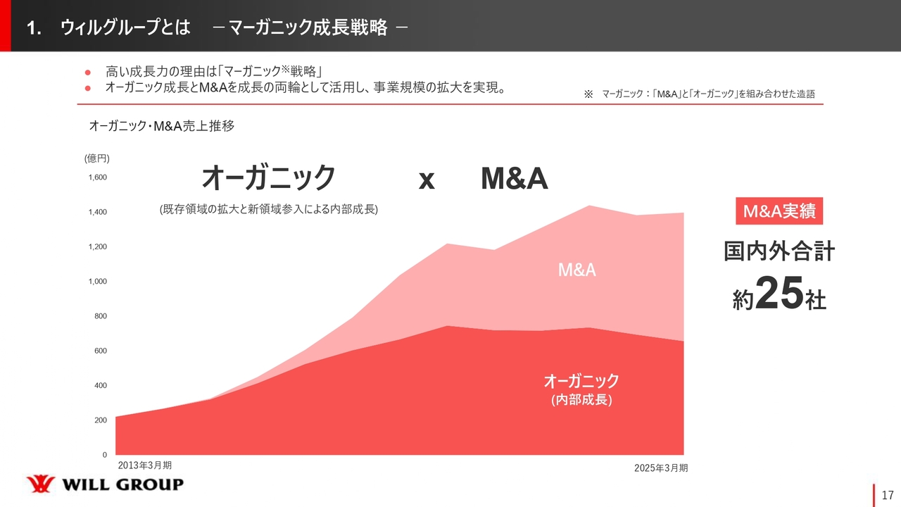そのため、国内だけでなく海外でも、すべてをオーガニックで行うと時間がかかるところを、オーガニックとM&Aの活用との組み合わせにより、力強い成長を実現している点がウィルグループの特徴です。
