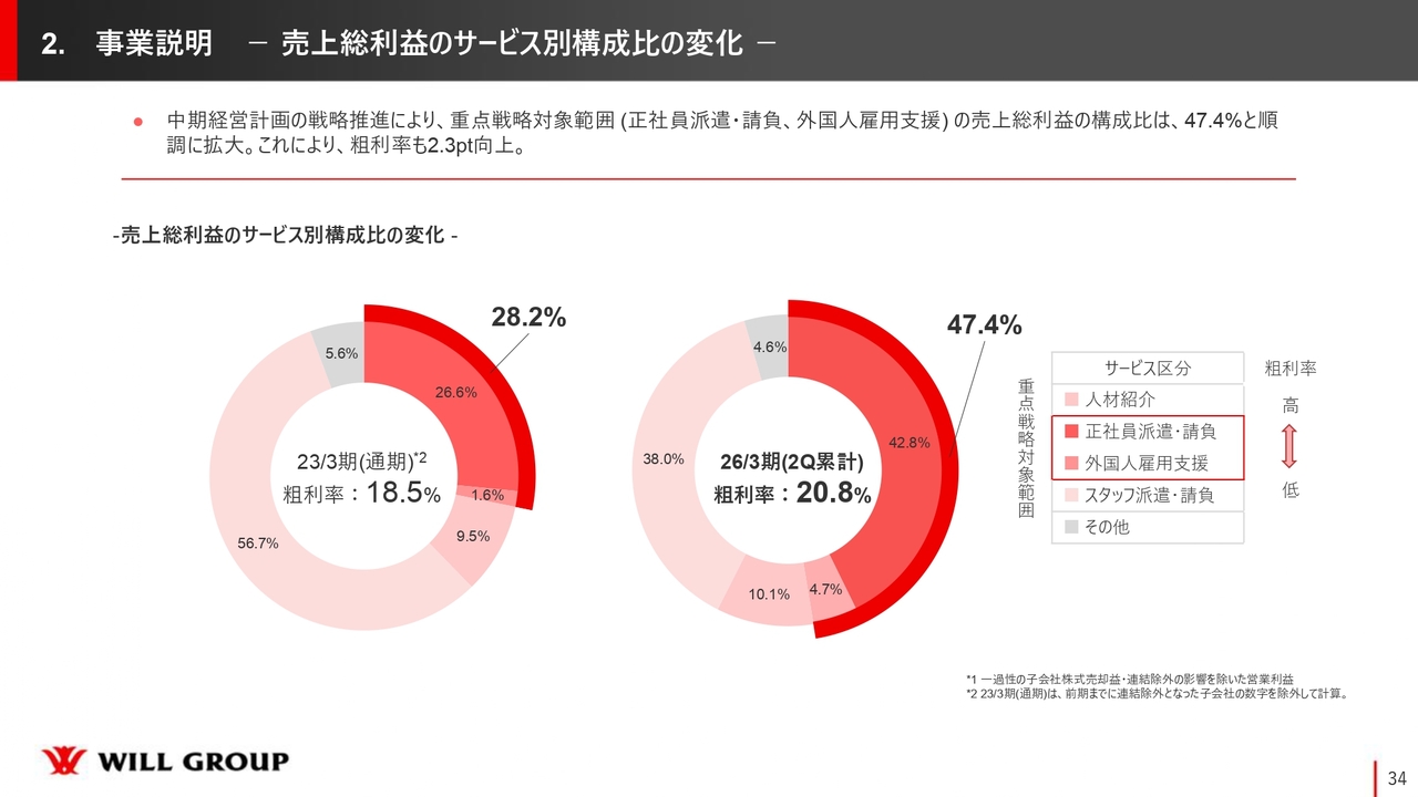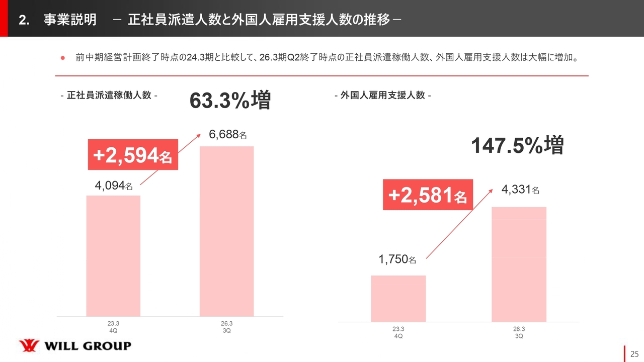 角:正社員派遣と外国人雇用支援の売上総利益の比率です。当社の戦略的取り組みにより、正社員派遣と外国人雇用支援の売上総利益の割合が、2026年3月期第2四半期累計では約半分にまで増加しています。