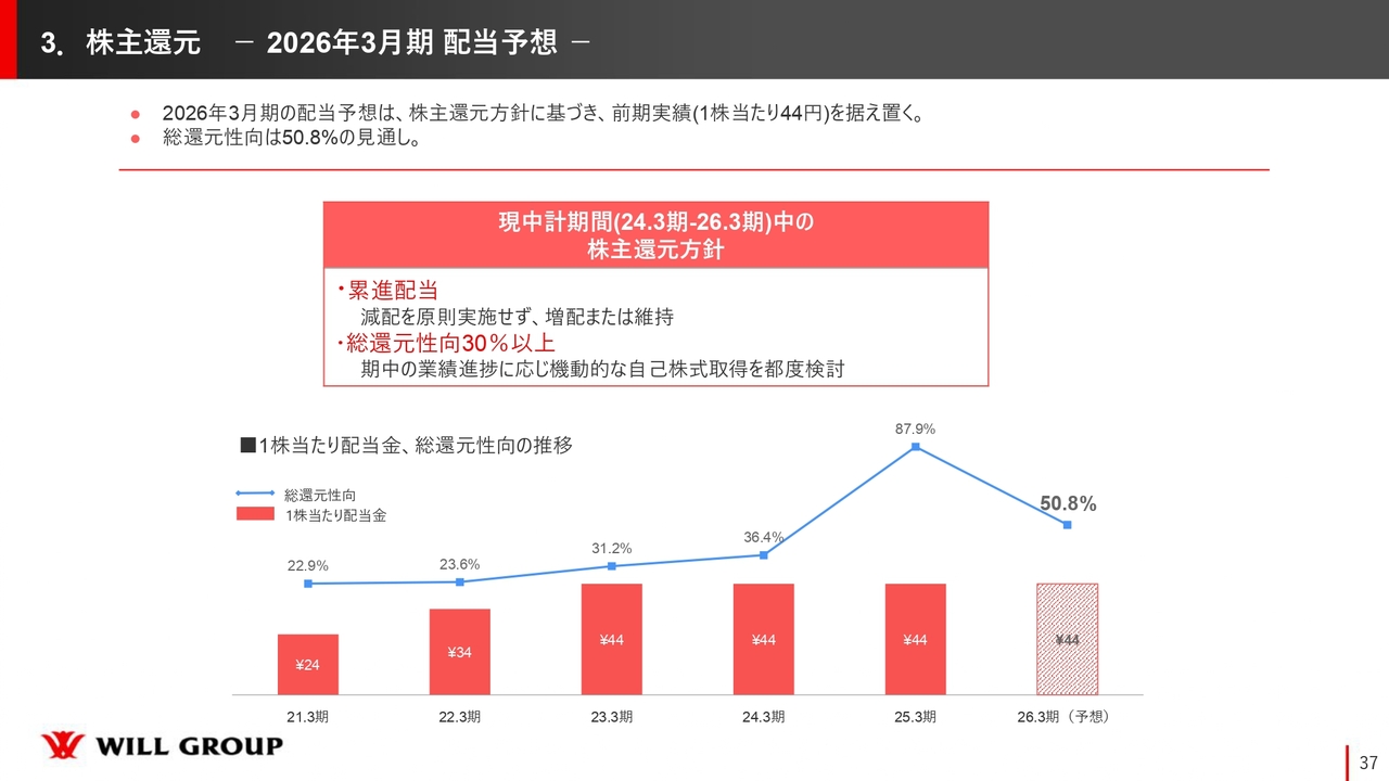 最後に、株主還元です。2026年3月期の配当予想は、前期実績の1株あたり44円を据え置く予定です。総還元性向は、50.8パーセントの見通しです。