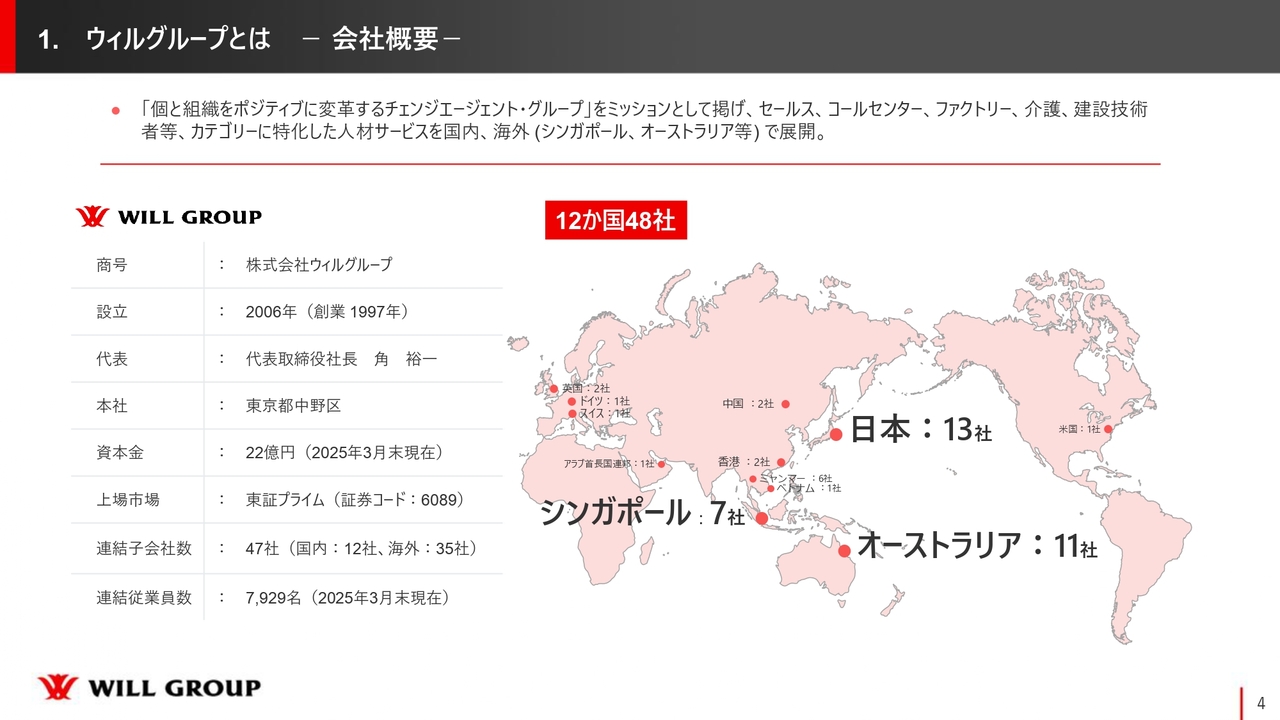 角:まずは、ウィルグループの概要です。冒頭でもご紹介いただきましたが、当社は人材サービスを日本、シンガポール、オーストラリアを中心に展開しています。人材サービスといってもさまざまな種類がありますが、主に展開しているのは人材派遣と人材紹介です。