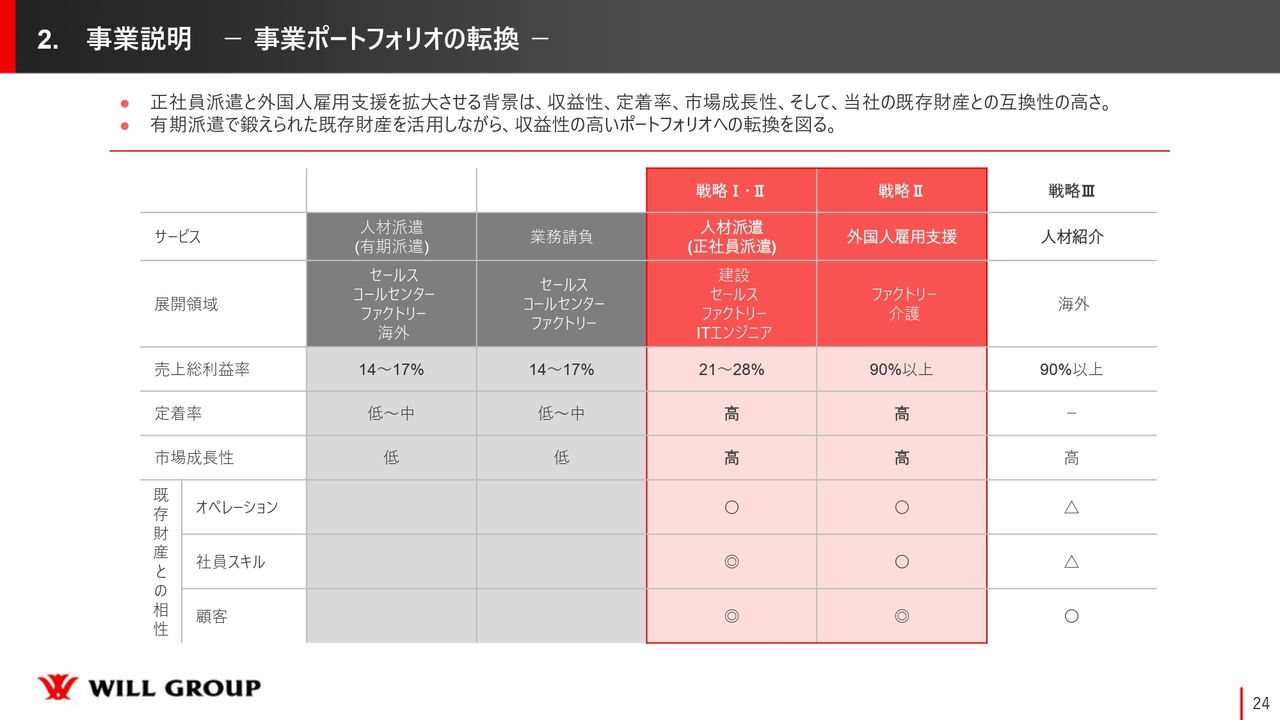 回答:現時点で定量的な影響についてはお示ししていませんが、戦略1・2で推進している正社員派遣および外国人雇用支援については、いずれも当社の中で収益性の高いモデルと位置付けています。これらの構成比が高まることで、全体の利益率向上に寄与していくものと考えています。