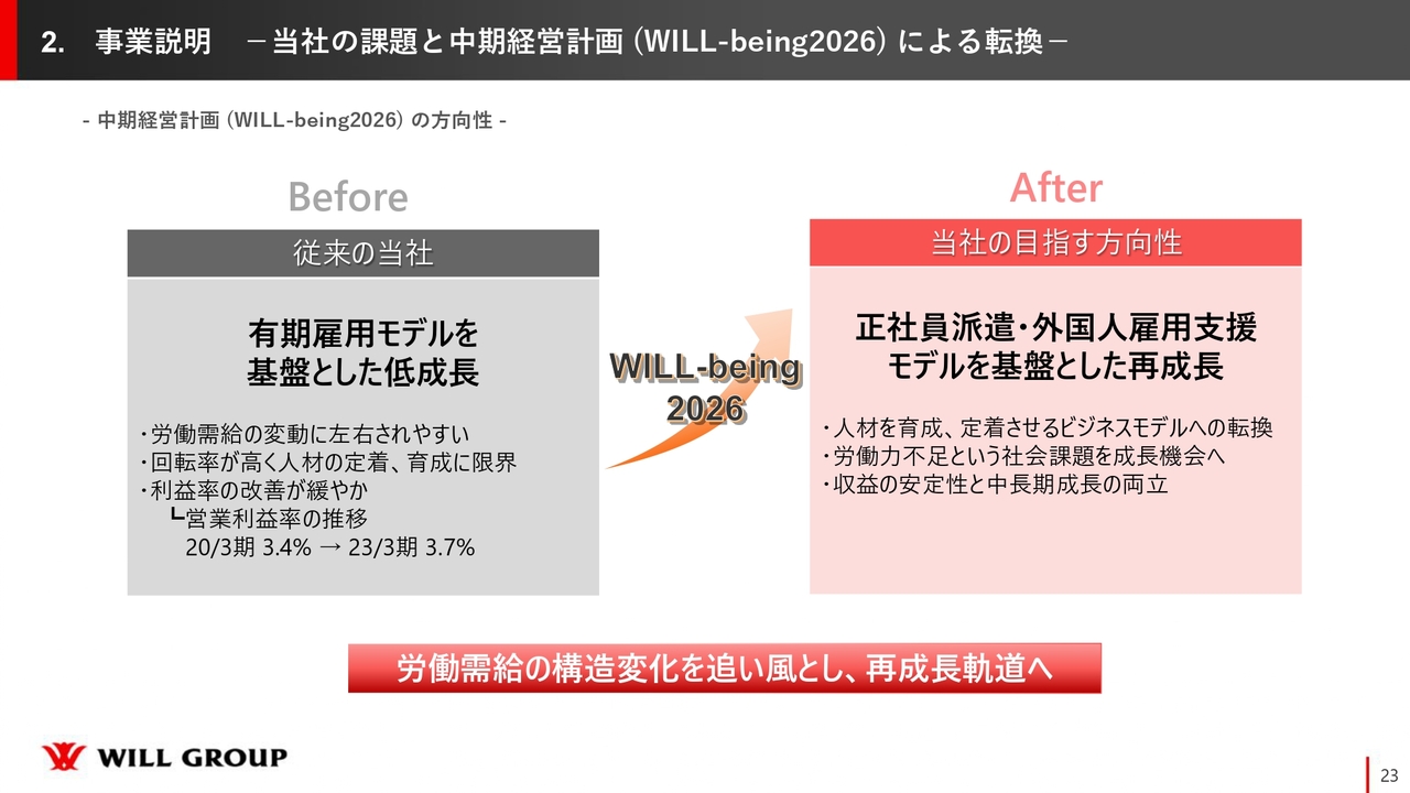 引き続き、正社員派遣、外国人雇用支援、人材紹介といった収益性の高いビジネスモデルの拡大に注力し、収益基盤の強化、高収益体質への転換を図っていく方針です。